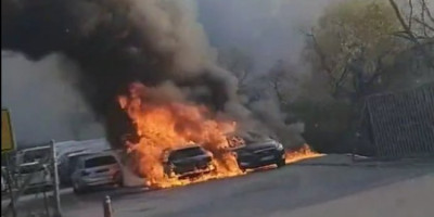 Automobili u plamenu, brojne ekipe vatrogasaca, policije i Hitne pomoći na licu mesta.