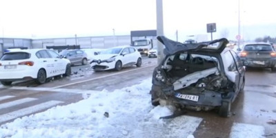 Nesreća se dogodila na silasku sa Pančevačkog mosta u smeru ka Pančevu, a jedno vozilo je potpuno uništeno.