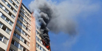 Požar je izbio u višespratnici i crni dim se širi. Vatrogasci preko platforme gase vatru.