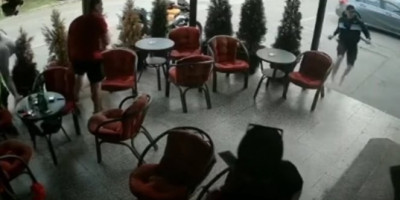 Na drugom snimku se jasno vidi kako dva čoveka beže ka kafiću i utrčavaju u njega, dok ih mladić sa bombom u ruci juri. Oni su uleteli u objekat i uspeli su da se sakriju, ali je bombaš bacio eksplozivnu napravu u kafić.