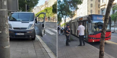 Parkirajući na potpuno nezgodnom čitaj nedozvoljenom mestu, vozač kombija kao da je na tren zaboravio gde se nalazi. U vozilu zaustavljenom na trotoaru u jeku najveće gužve pokušao je da otvori vrata vozača i verovatno izađe na ulicu.