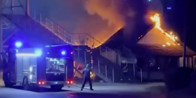 Na snimku se vidi kako vatra guta objekat, iz njega kulja crni dim.
