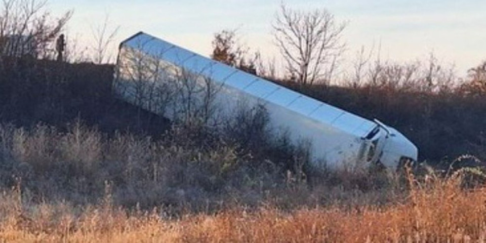 Kamion je sleteo sa puta na travu pored i prevrnuo se na desni bok. Moguće da je uzrok poledica na putu, jer je jutros bilo izuzetno klizavo, rekao je jedan od očevidaca.