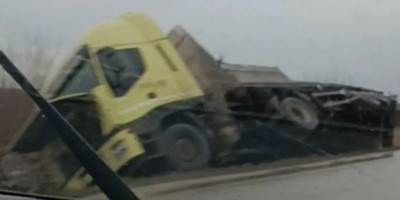 Kamion je upao u kanal pored puta, a za sada nema informacija da li ima povređenih lica, kao ni kolika je materijalna šteta.