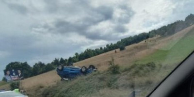 Od siline udara jedno od vozila koje je učestvovalo u saobraćajnom udesu sletelo je sa kolovoza i zaustavilo se u njivi prevrnuto na krov.
