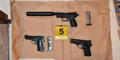 Pretresom stana i drugih prostorija P. M., kako se precizira, otkriveno je oko 900 grama marihuane, 16 špriceva sa kanabisovim uljem, tri pištolja, prigušivač, dve bombe, više komada municije različitog kalibra, kao i 3.550 evra, tri mobilna telefona i vagica za precizno merenje.
