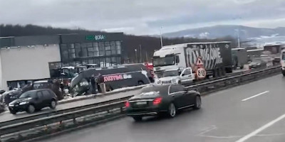 Primetna su oštećenja autobusa sa prednje strane, ali se zbog položaja vozila ne vidi u kojoj meri je oštećeno usled udarca sa automobilom.