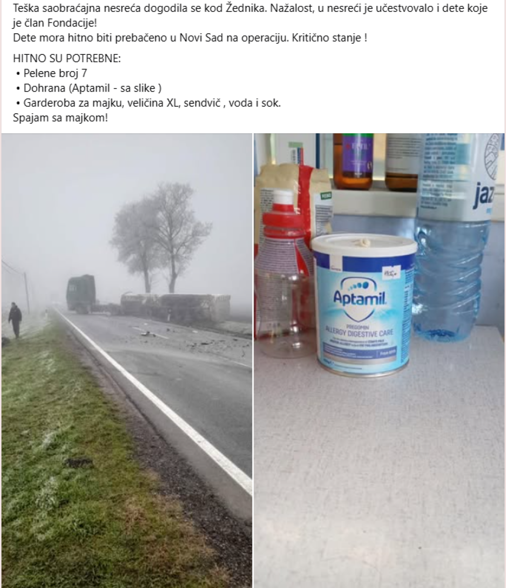U saobraćajnoj nezgodi je teško povređeno i dete koje je član Fondacije "Budi human". Iz grupe "Naše malo je nekome sve" su apelovali svojim pratiocima na Fejsbuku da se obezbedi dohrana za bebu, pelene za dete, kao i garderoba za majku, za prvu ruku.