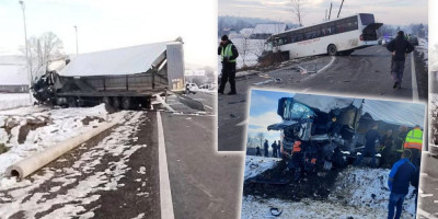 U potpunosti je uništen prednji deo kamiona, kao i autobusa.