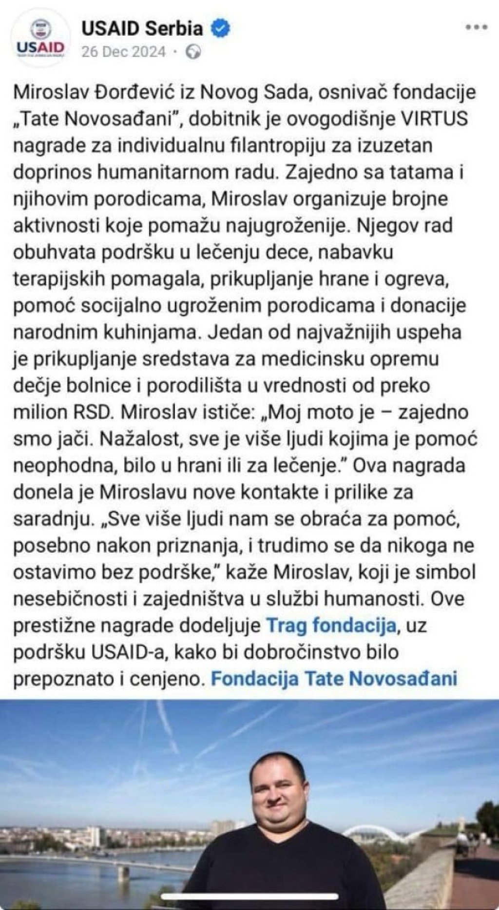 Ono što je zanimljivo, drugi osnivač Tata Novosađana, Miroslav Đorđević je povezan za američkom agencijom USAID, koja je poznata po finansiranju NVO sektora širom sveta sa ciljem rušenja aktuelnih i legalno izabranih političkih sistema.