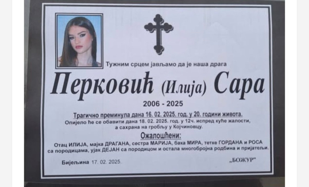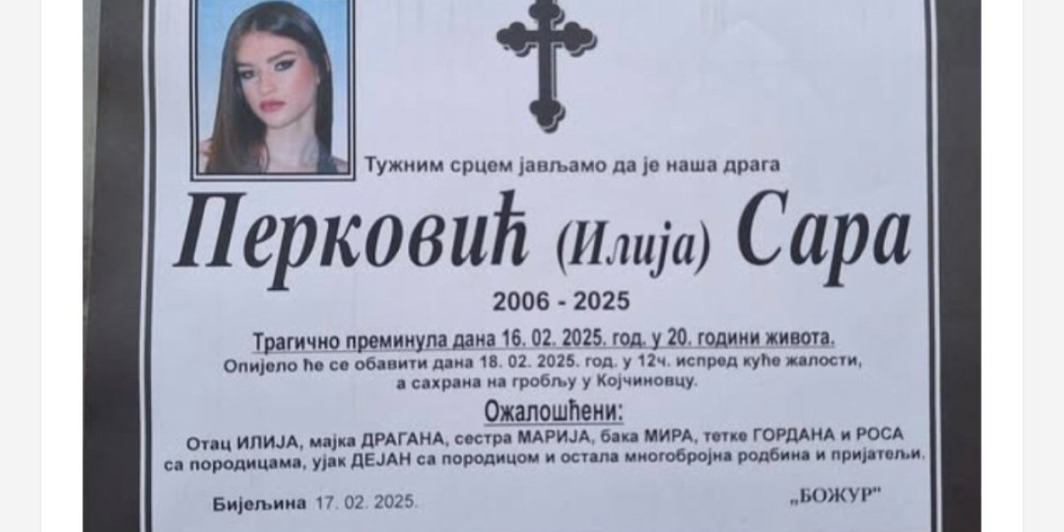 - Sara je iza sebe ostavila neutešne roditelje i sestru, opelo je počelo u 12 sati u kući žalosti,a nakon toga sahrana će biti na groblju u rodnom Kojčinovcu - kaže izvor upoznat sa situacijom.