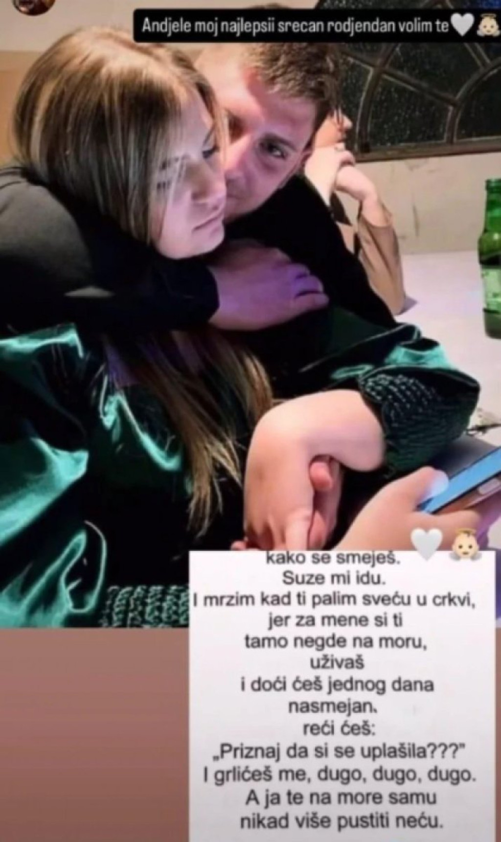 Anđele moj najlepši, srećan ti rođendan. Volim te. Kako se smeješ, suze mi idu i mrzim kad ti palim sveću u crkvi, jer za mene si ti tamo negde na moru, uživaš. I doći ćeš jednog dana nasmejan i reći ćeš: "Priznaj da si se uplašila?!" I grlićeš me, dugo, dugo, dugo - napisala je u potresnoj poruci Anđela Stevanović na svojim društvenim mrežama.