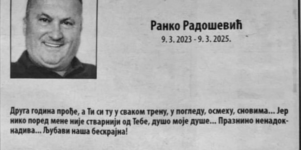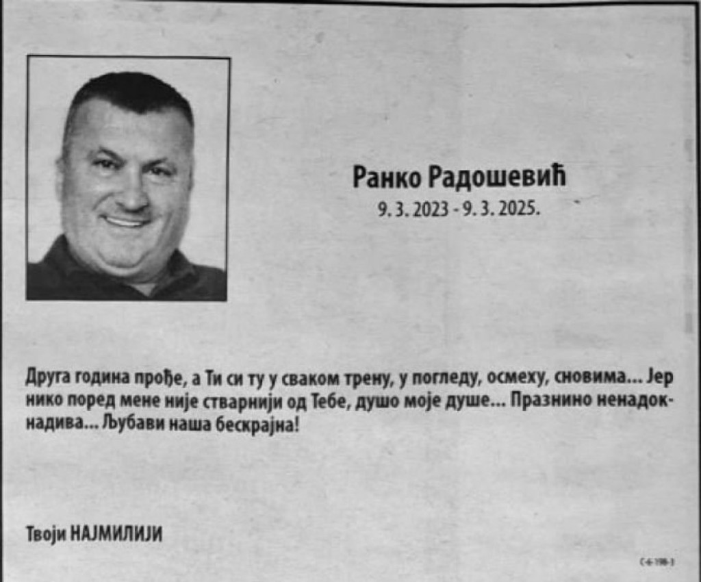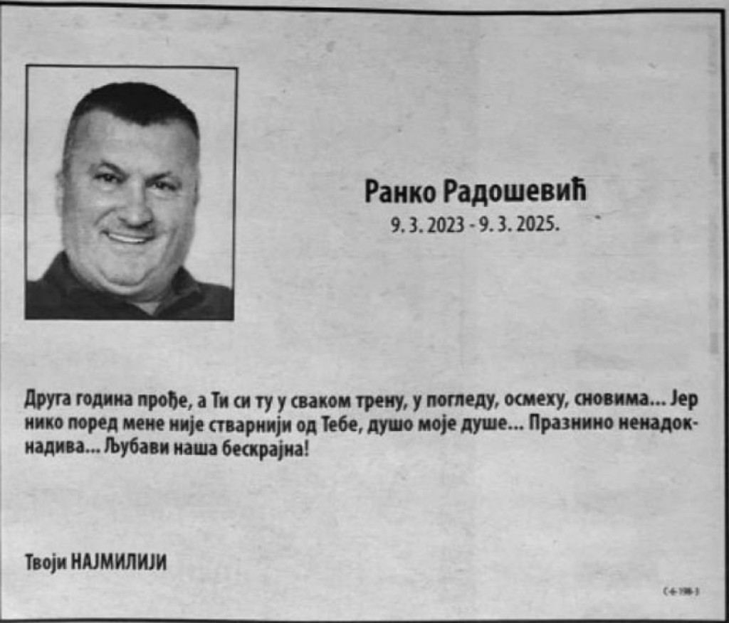 - Druga godina prođe, a ti si tu u svakom trenu, u pogledu, osmehu, snovima... Jer niko pored mene nije stvarniji od tebe, dušo moje duše... Praznino nenadoknadiva... Ljubavi naša beskrajna - piše u jednoj od čitulja potpisanoj sa "Tvoji najmiliji".