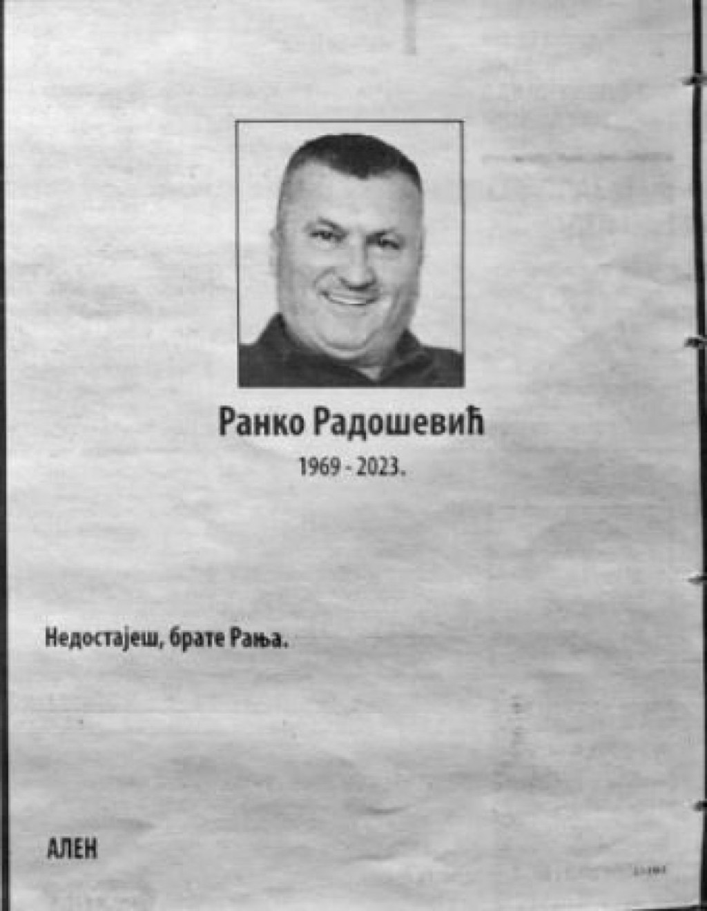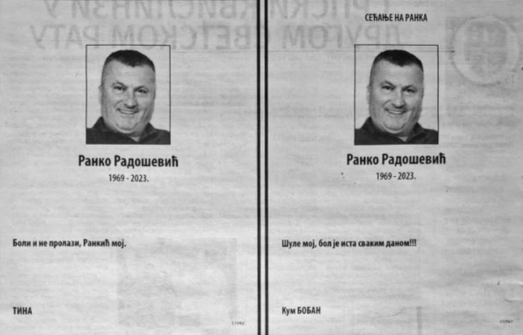 Ranko Radošević zvani Eskobar (53) bio je navodni vođa "nikšićko-kvartaškog klana" blizak "škaljarcima". Likvidiran je pre tačno dve godine na današnji dan kada je namamljen, a potom i izrešetan u restoranu jedne pumpe u Rušnju.