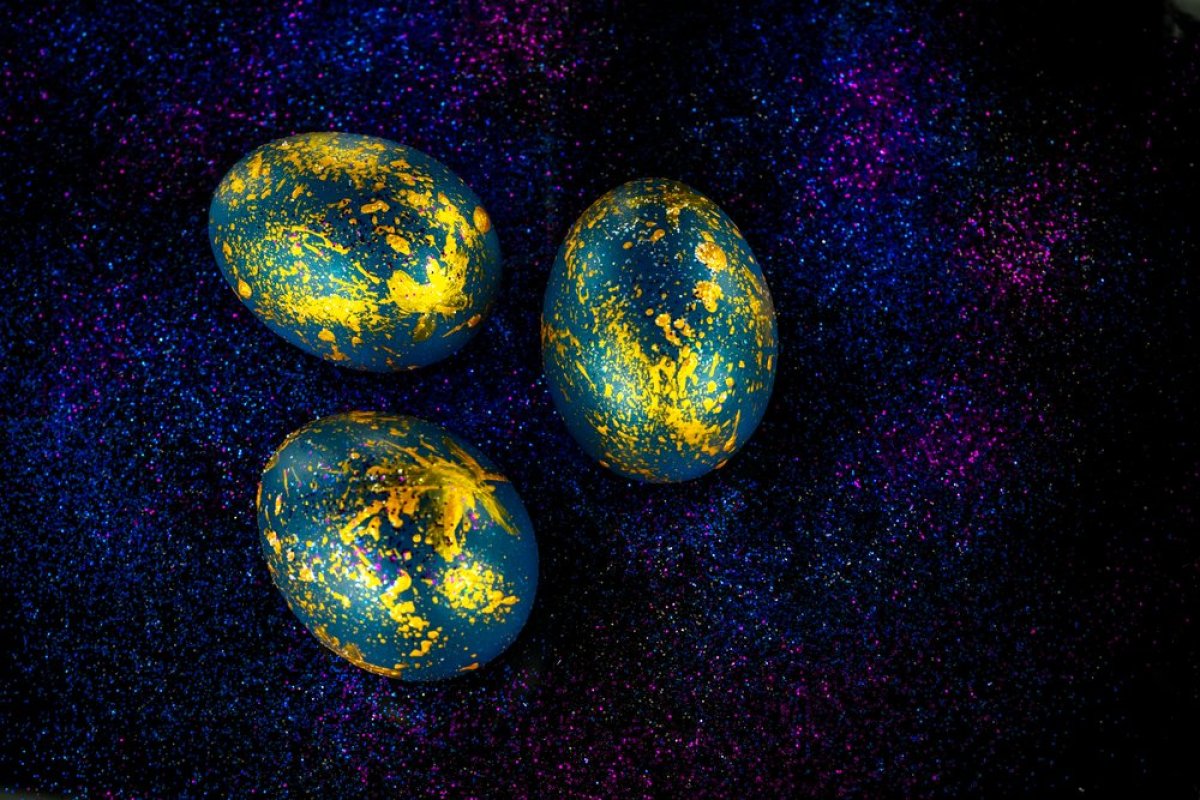 Stavite jaja na tanjir da se potpuno osuše. Ovaj proces može trajati neko vreme, ali boje će se sjajno sjediniti, stvarajući pravi galaktički izgled. Na kraju uzmite staru četkicu za zube i umočite je u belu boju, pa poprskajte po jajetu da dobijete male tačkice poput zvezda u galaksiji. Za još sjajniji izgled, možete premazati jaja sa malo ulja.