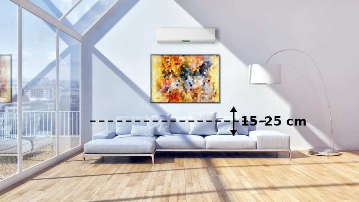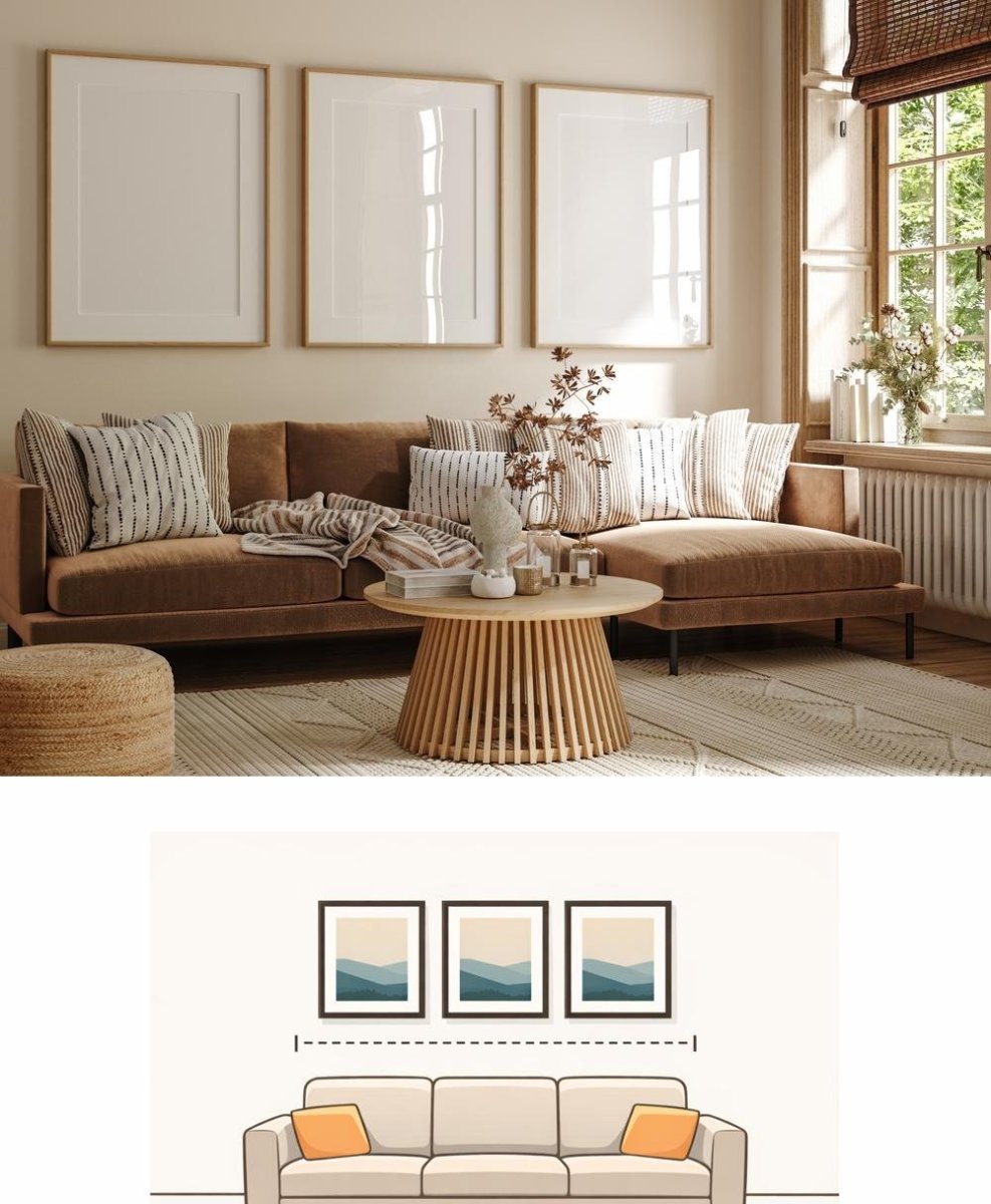 To je razmak koji omogućava da slike budu vizuelno povezane sa sofom, ali da pri tom ne izgledaju prenisko ili prenisko "plutaju" na zidu.