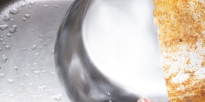 Na zadnju stranu tiganja pospite so i sodu bikarbonu, pa sipajte deterdžent, oko 50 ml. Sve dobro istrljajte metalnom žicom, pa prekrijte dno tiganja papirnim ubrusima i prelijte ih sirćetom.
