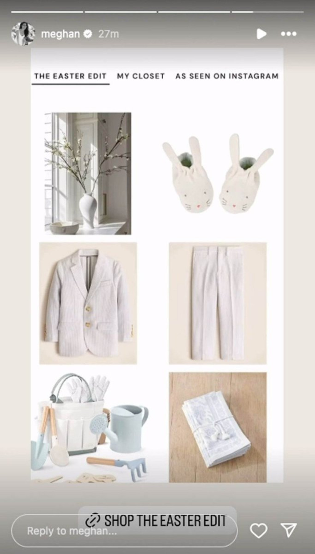 Megan je otkrila da njena deca nose i odeću marke Boden, u kojoj smo viđali princa Luija. Podelila je i sitnice koje mogu da se koriste za porodično fotografisanje u danima Vaskrsa, poput slatkiša u obliku šargarepa, opreme za lov na jaja, cipelice inspirisane zečevima i sl.