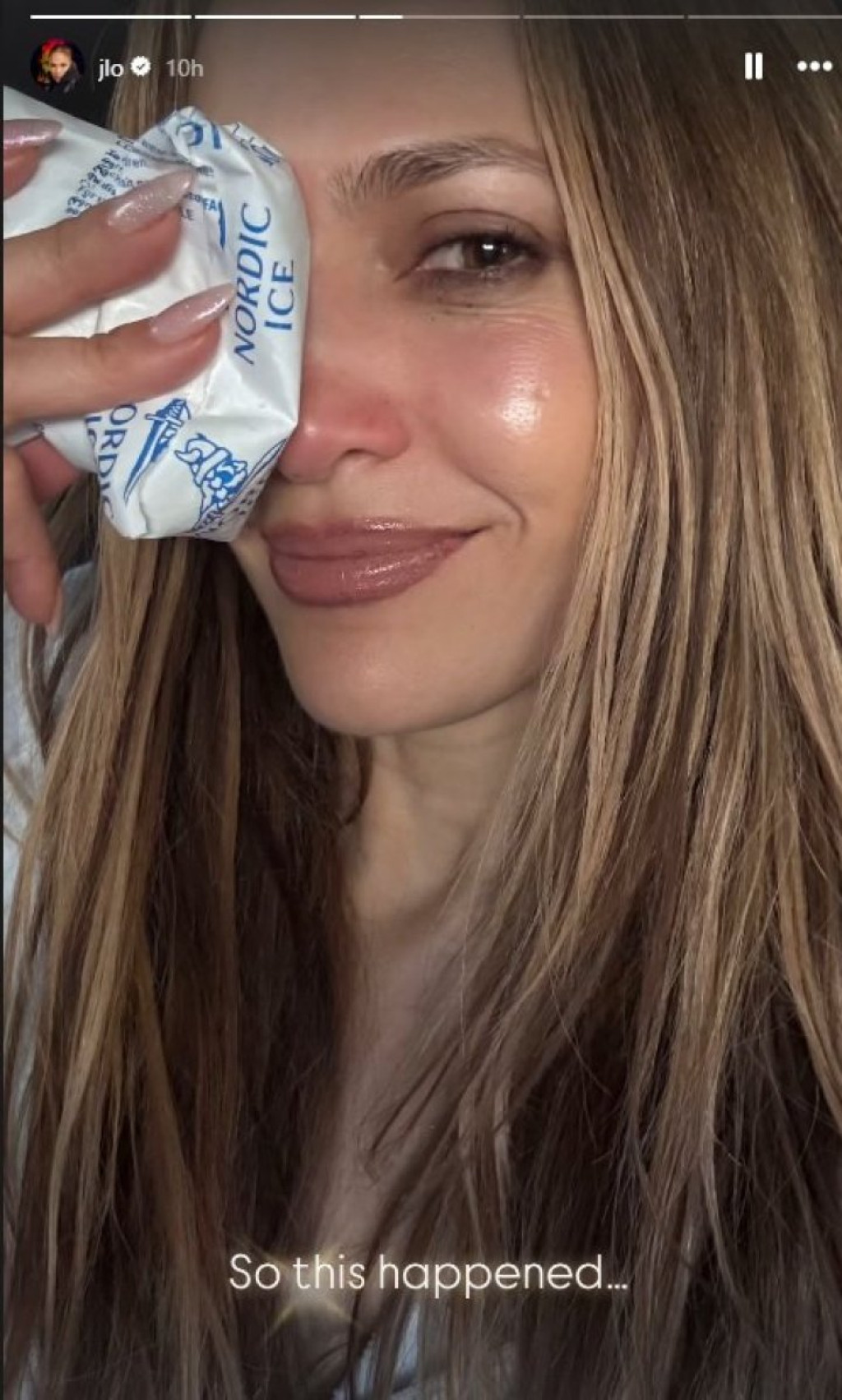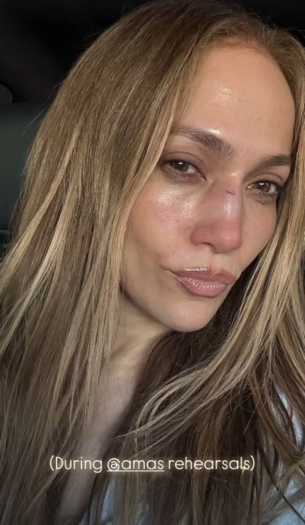 Dženifer Lopez je podelila na svom Instagram storiju fotografiju bolne posekotine preko nosa. Na drugom snimku vidi se kako hladi povredu ledom. Otkrila je da se nezgoda dogodila tokom proba za predstojeću dodelu American Music Awards, koju će upravo ona voditi, piše People.