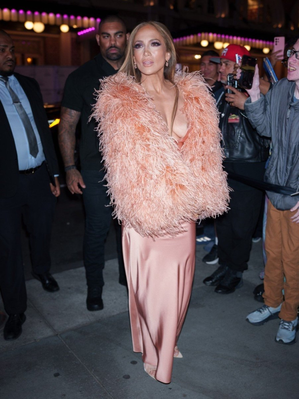 Dženifer Lopez, 55-godišnja pevačica i glumica, ponovo je pokazala zašto je sinonim za glamur čak i kada se stvari ne odvijaju po planu. Na humanitarnom koncertu "Ring Them Bells", održanom u čast 98. rođendana kompozitora Džona Kendera u Stivn Sondhajm teatru u Njujorku, Dženifer se pojavila u izazovnoj haljini boje breskve dubokog dekoltea sa perjanim rukavima, i bez brushaltera.