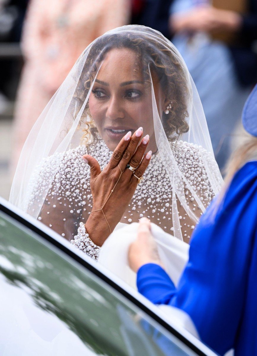Mel Bi je na venčanju zablistala u luksuznoj venčanici boje slonovače, izrađenoj po meri, koja je, prema izveštajima, imala detalje poput perli na dekolteu i rukavima, kao i dugačak veo.