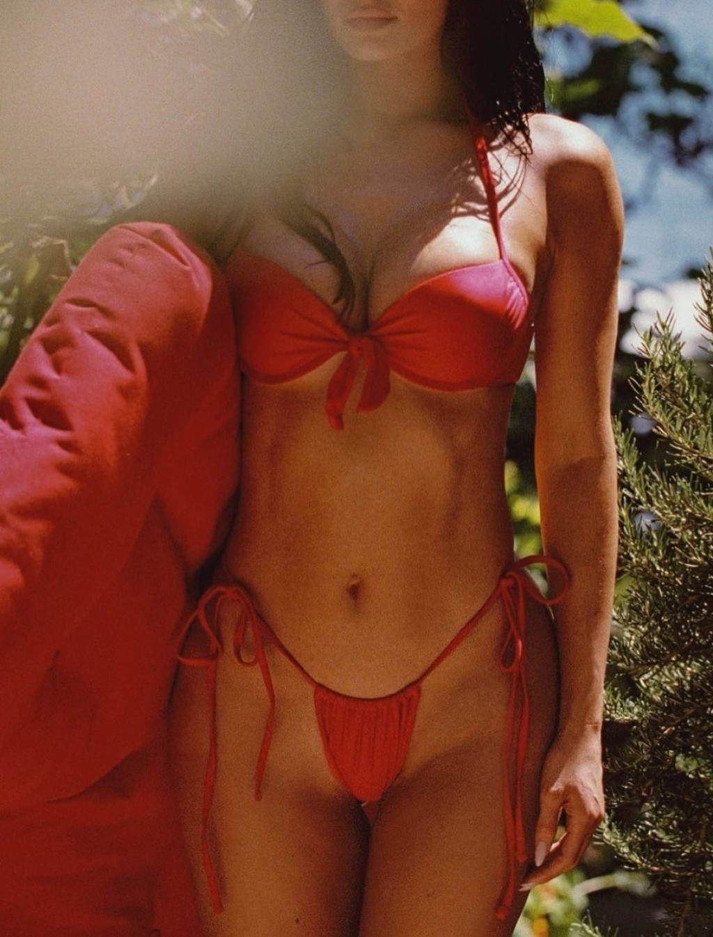 Minijaturni crven bikini je istakao njene obline. Gornji deo kupaćeg je jedva obuzdao bujne grudi, a taanga gaćice su jedva pokrile međunožje. Rijaliti zvezda se ne libi da se razgoliti, ponosna na svoje zategnuto telo.