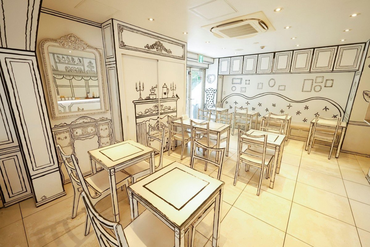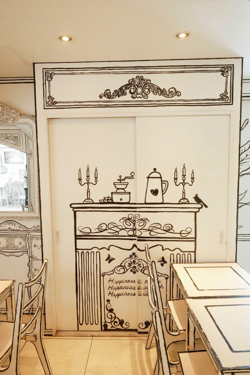 Na prvi pogled, deluje kao da ste zakoračili u neku skicu olovkom. Zidovi, stolice, pod i šank izgledaju ravno i nestvarno, obloženi crnim linijama i belim površinama. Sve što je u prostoru pažljivo je oslikano ručno, stvarajući osećaj da ste deo dvodimenzionalnog sveta.
