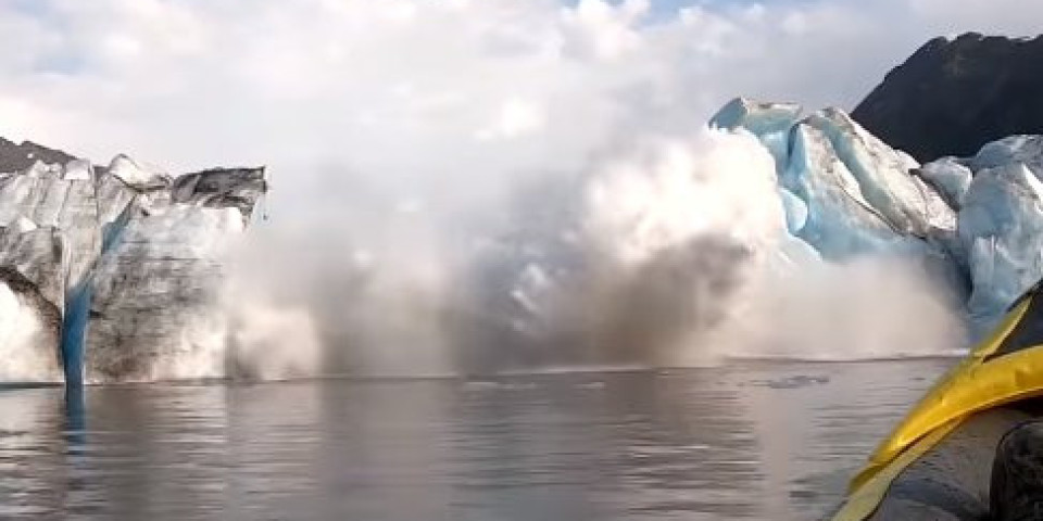 Ovaj kajakaš je čuo zvuk poput pucnja iz puške, pa je prišao bliže glečeru da video šta se desilo. Ogromni ledeni komadi koji su padali u vodu proizveli su taj zvuk.