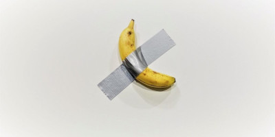 Banana zalepljena debelom selotejp trakom delo je Mauricija Katelana i predstavila ga je u sredu galerija "Perotin". Banana je kupljena u supermarketu u Majamiju i zalepljena je parčetom sive trake.