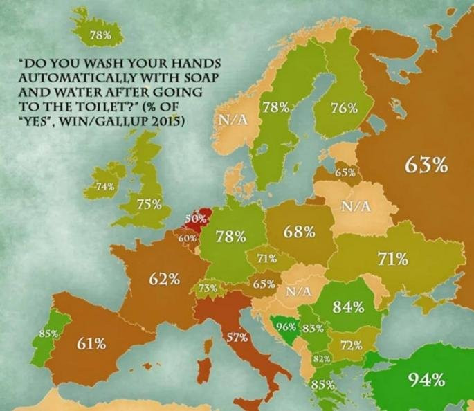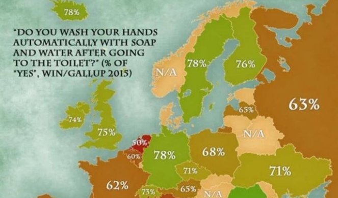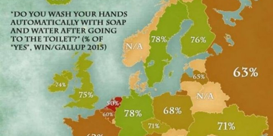 Na poražavajućem poslednjem mestu u Evropi nalaze se Holanđani sa svega 57 odsto stanovništva koje pere ruke nakon odlaska u toalet.