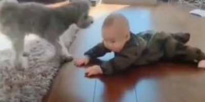 Na ovom snimku, pas se svojski trudi da nauči bebu nekim pokretima, koji su opisani kao vežbe. Kako bi bolje objasnio šta treba da radi, pas staje ispred bebe i pokazuje joj pokrete. Ovo će vas sigurno nasmejati!