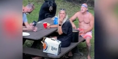 I sve je bilo u redu, dok jedan krupni crni medved nije nonšalantno prišao ljudima i pridružio se zabavi, i to nalakćen na sto, kao pravi baja.