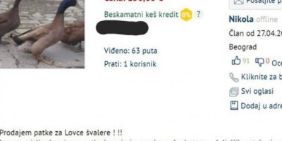 "Prodajem patke za lovce švalere. Ja sam mislio da ove patke kupuju jer su skoro duplo teže od običnih pataka i nosivost im je oko 300 ja godišnje, ali ne... Ove patke mi najviše kupuju lovci švaleri - za žene su ceo dan bili u lovu i donesu veliku divlju patku. Požurite jer je lov na patke do 28. februara", stoji u ovom neobičnom oglasu sa jedne farme.