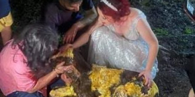 Na slikama koje su obišle svet vide se njih dvoje: mladoženja u svečanom odelu, mlada u srebrnoj venčanici kako bez ijedne trunke dvoumljena, u blatu, pomažu mokrom teletu da stane na noge.