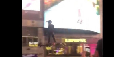 Novi video snimak koji postaje viralan na društvenim mrežama prikazuje smelog avanturistu sa šlemom kako proleće kroz Tajms Skver u Njujorku - na nečemu što se čini kao dron sa osam rotora, krstareći solidnih tri metra iznad zemlje