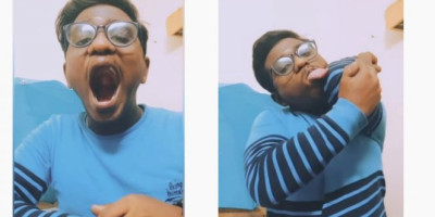 Stavlja sićušni komadić rukavice da pokrije polovinu jezika, a zatim počinje da piše tamilska slova u grafikon. Takođe, može da dodirne lakat jezikom.