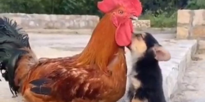Mali pas očigledno voli petla, pa ga je sve vreme ljubio, a na kraju i pronašao način da da ga zagrli.