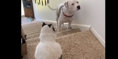 Pas je pošao stepenicama, a onda je spazio mačku. Na sam pogled na mačku nije smeo ni da prođe pored nje, a kamoli da se pomeri.