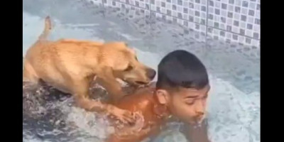 Neverovatna je scena da je svom snagom skočio na dečaka i šapama uspeo da ga gurne pod vodu.
