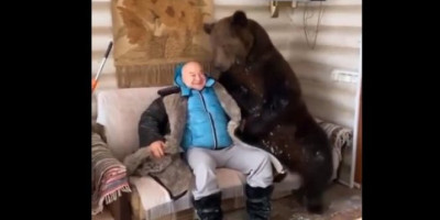 Upravo takva scena dogodila se čoveku koji je odmarao na kauču. Ne znamo da li se on i medved znaju od ranije, ali je očigledno da su prijateljski raspoloženi.