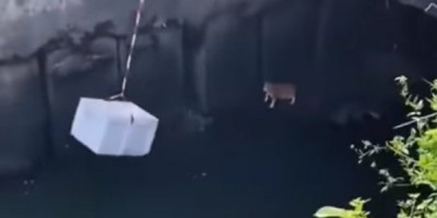 On je spustio belu kutiju u nadi da će se maca popeti u nju, a u jednom momentu se činilo kao da se to neće desiti.