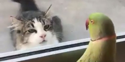 Mačak je stajao ispred prozora, a onda je ugledao zelenog papagaja kroz staklo. Papagaju je ovo bilo zanimljivo, pa je prijhvatio igru.
