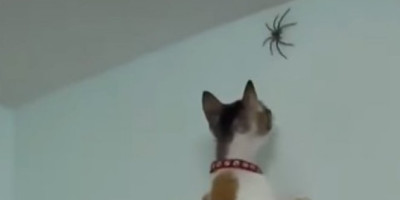 Na snimku se vidi kako su mačku približili ogromnom pauku, koji je stajao na zidu, a ona ga je u samo par sekundi uhvatila šapicama.