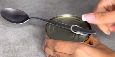 Dršku od kašike provucite kroz rupicu od jezička konzerve, pridržite malo prstima gornji deo i povucite ka sebi.