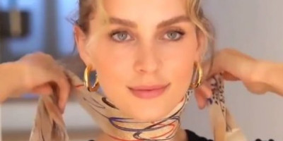 Sve što je potrebno jeste da spojite krajeve dijagonalno, a zatim je "urolate" na malo veću širinu (sa ravnim ivicama, takoreći da bude pravouganik). Potom je stavite spreda na vrat i ukrstite iza vrata. Uhvatite je spreda, zavrnite na jednu stranu, pa kroz omčicu koja se napravila, prvo provucite jedan, a zatim drugi kraj marame, unakrsno. Malo pritegnite i to je to.