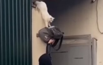 Maca je ostala zaglavljena na visokom zidu, ali je ipak imala dovoljno poverenja u dečka, dozvolivši mu da je spusti.