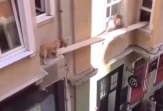 Međutim, na svu sreću, nekoliko ljudi se okupilo i od platna napravilo sigurnosnu mrežu, za slučaj da se ipak oklizne i padne. S druge strane, sa susednog prozora, čovek je provukao dasku, a pas je preko nje došetao do njega i priča je imala srećan kraj.