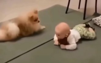 Pomeranac se i te kako potrudio da bebi pokazuje kako da puzi, a ona ga je pažljivo posmatrala i zapravo imitirala ono što radi.