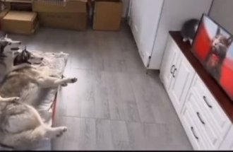 Na snimku se vidi kako su dva haskija ležala i uživala u svom danu, dok je jedna mačka, kako to već obično biva, smišljala kakav nestašluk da napravi.