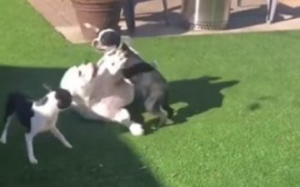 U jednoj sekundi, veći pas je uspeo manjeg toliko da odgurne, da je on bukvalno poleteo u vazduh, ali na svu sreću bezbedno sleteo.